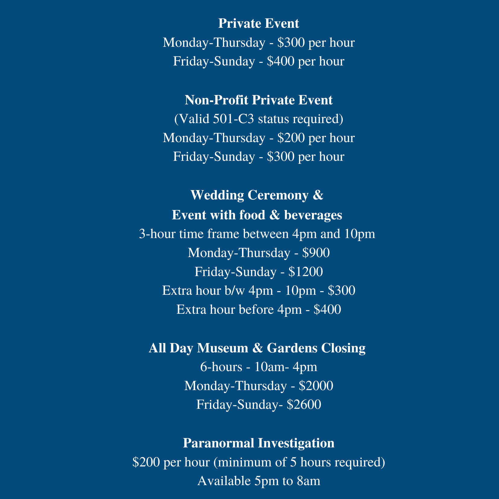 _____________________________________________________________________________________________________ Rental includes:- Access to the acre of Colonial Revival gardens, and Courtyard - Access to the porches from the exterior stairs only. - Access to catering kitchen, restrooms, and Kidder Art Gallery - Access to the staff parking lot - Renters have the option of using their own vendors - Option to rent tables and chairs from the museum (limited qty.) - Option to rent a projector, screen, American flag, and television (interior use only) _____________________________________________________________________________________________________ Please Note:- The Burgwin-Wright House & Gardens has an occupancy limit of 100 people outside/50 people inside. - All event rentals require a $500 refundable damage security deposit. - A state sales tax of 7% will be applied to all rental fees. - A credit card service fee of 3% will be applied to all transactions. - Only beer and wine are allowed with additional $250 damage deposit.